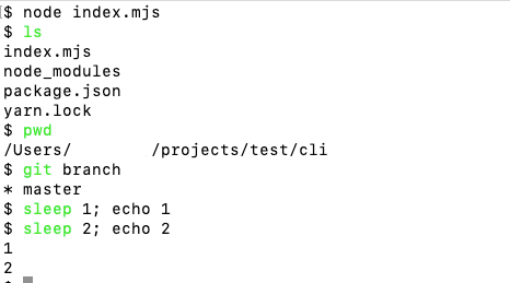 index.mjs1import {$} from 'contents/tools/zx'23await $`ls`;4await $`pwd`;5await $`git branch`;6await Promise.all([7$`sleep 1; echo 1`,8$`sleep 2; echo 2`9])